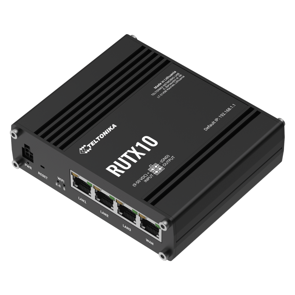 RUTX10: conectividade redundante via Wi‑Fi, Ethernet e Bluetooth com troca automática, gestão remota simplificada e carcaça robusta, garantindo internet industrial
